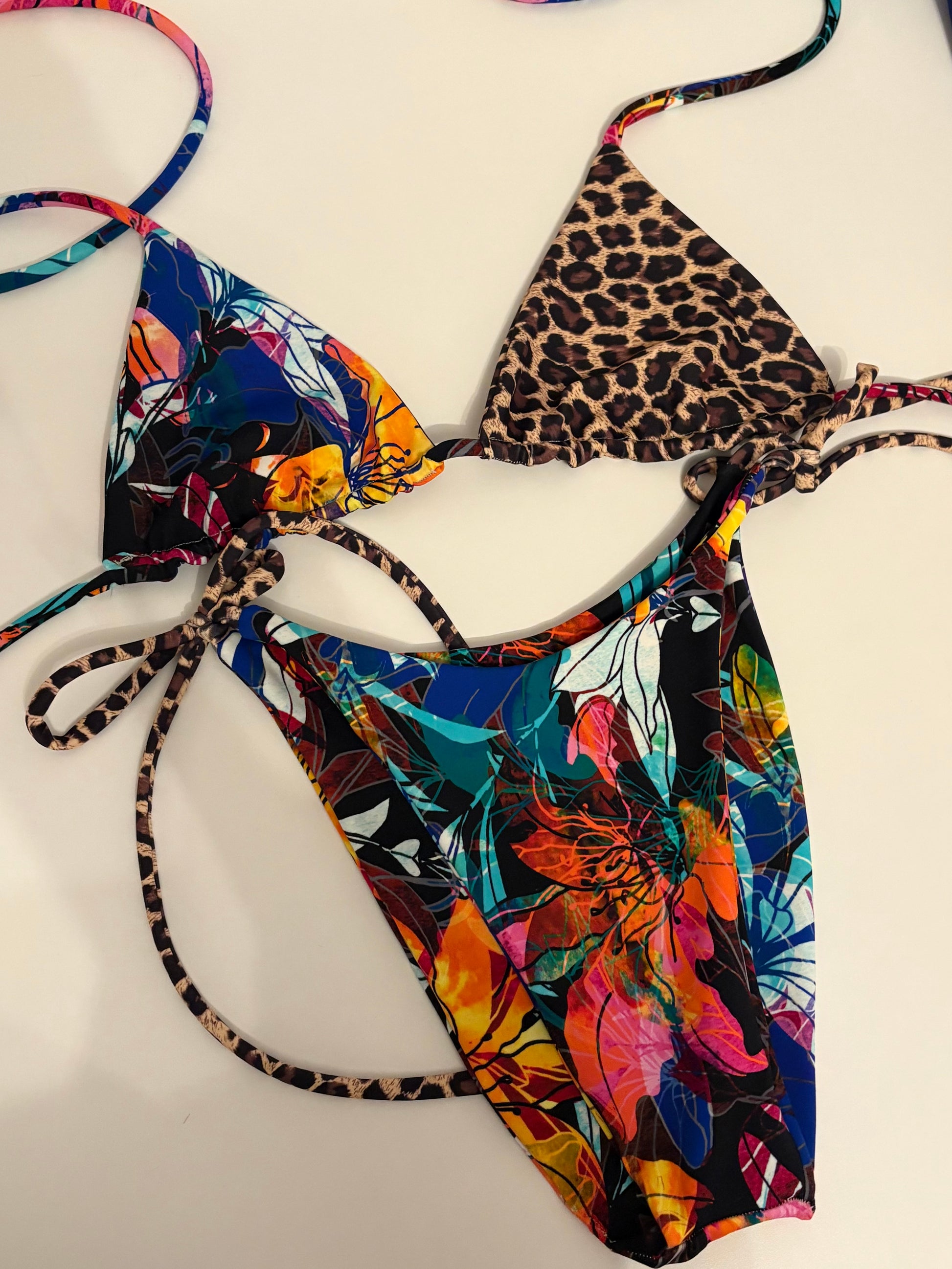 The Zahara Set pairs electric tropical florals with a sultry leopard contrast for the ultimate statement moment. Designed to turn heads, this triangle top and tie-side bottom offer adjustable comfort and a flattering, minimal fit.